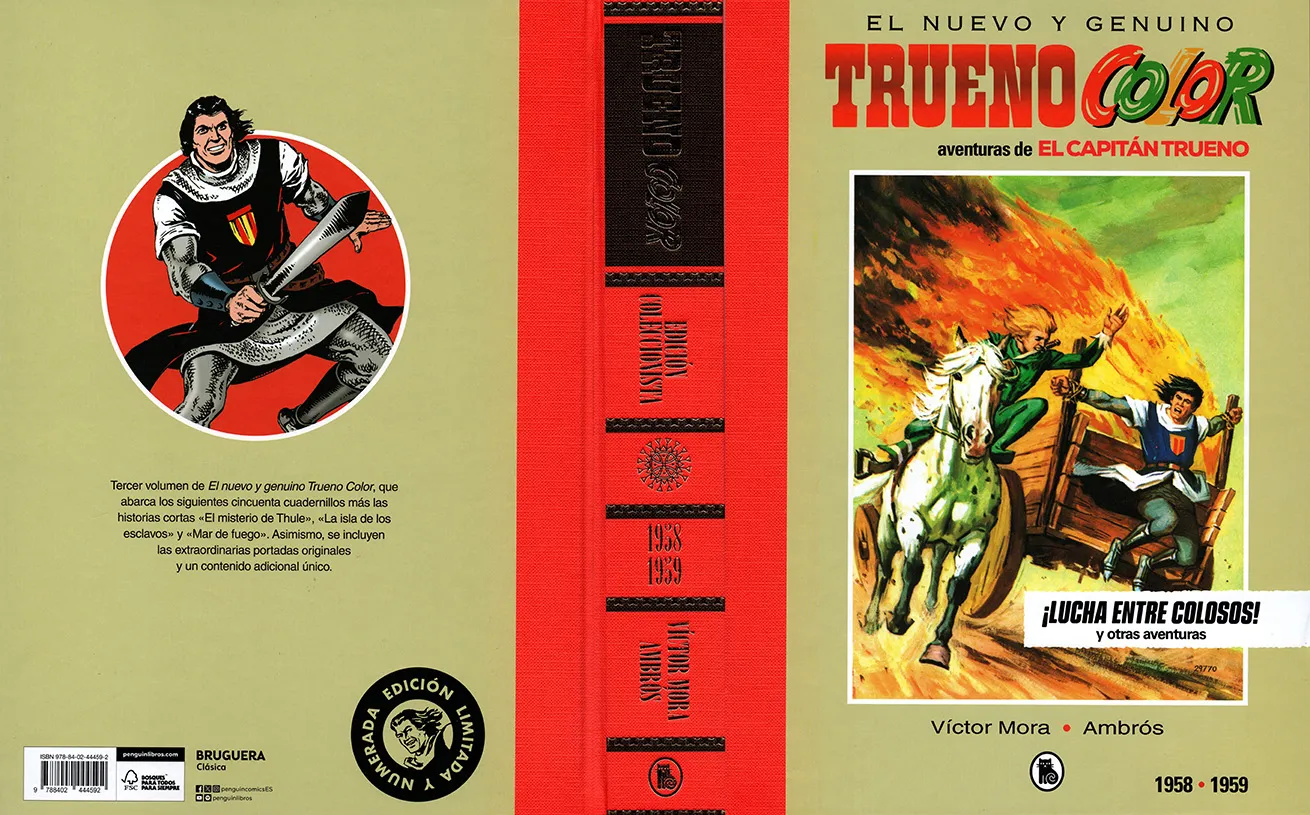 Promoción editorial: "CAPITÁN TRUENO 1958-1959 ¡LUCHA ENTRE COLOSOS!" es el título de un cómic publicado por Bruguera dentro de la colección "El nuevo y genuino Trueno Color". Este volumen incluye los números 104 a 154 de la serie, así como portadas originales y contenido adicional. El cómic narra las aventuras del Capitán Trueno, un personaje creado por Víctor Mora, y sus compañeros Crispín y Goliath.