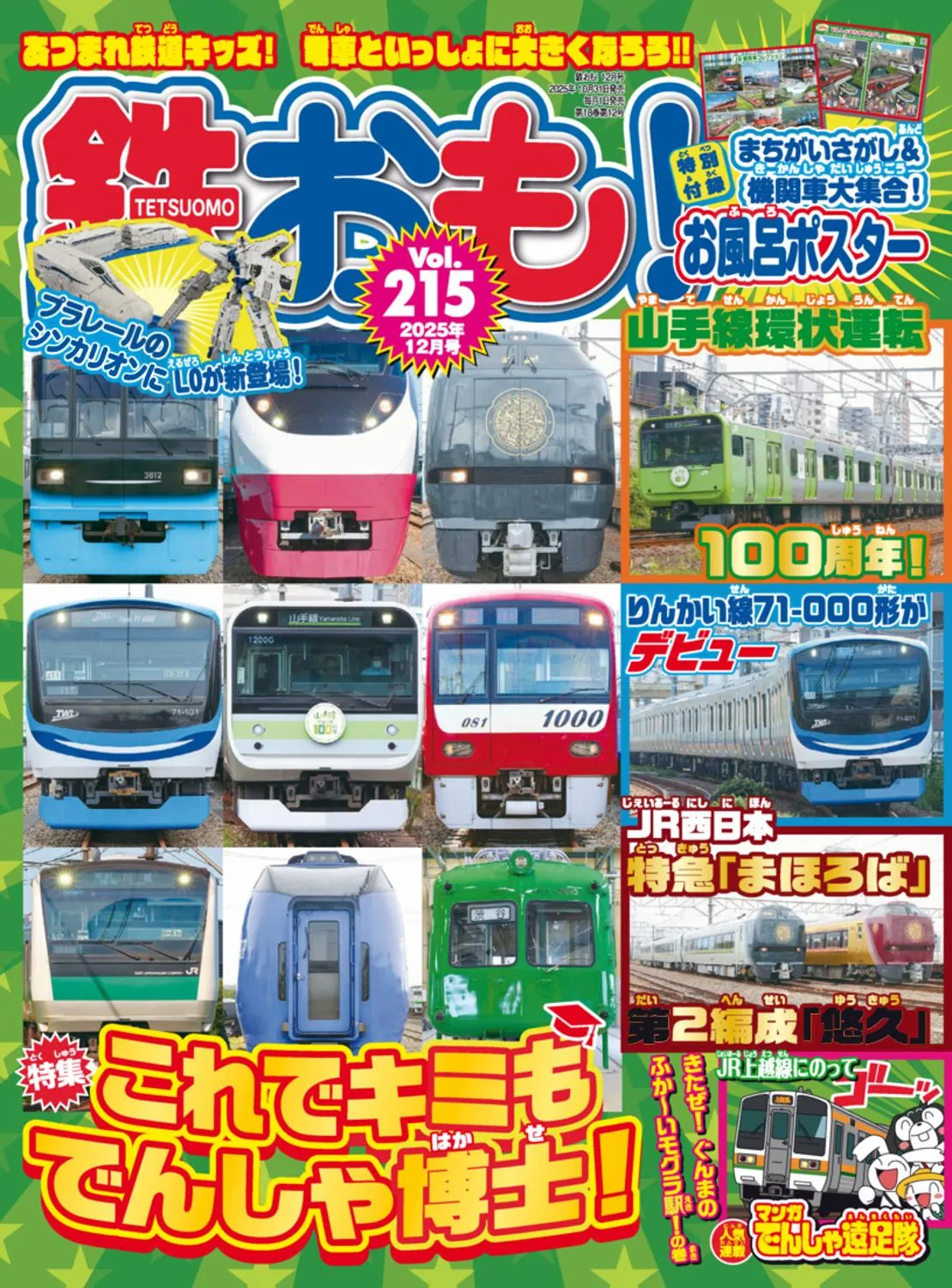 鉄道&おもちゃの情報誌。 電車好きのお子さん、そしてパパ・ママに大人気のファミリー向け鉄道総合情報誌がこの『鉄おも!』です。鉄道玩具・鉄道グッズから沿線のお出かけ情報、全国各地の鉄道イベントや鉄道車輌・鉄道模型に至るまで、幅広いジャンルの情報を楽しいキャラクターたちを交えてご紹介します。