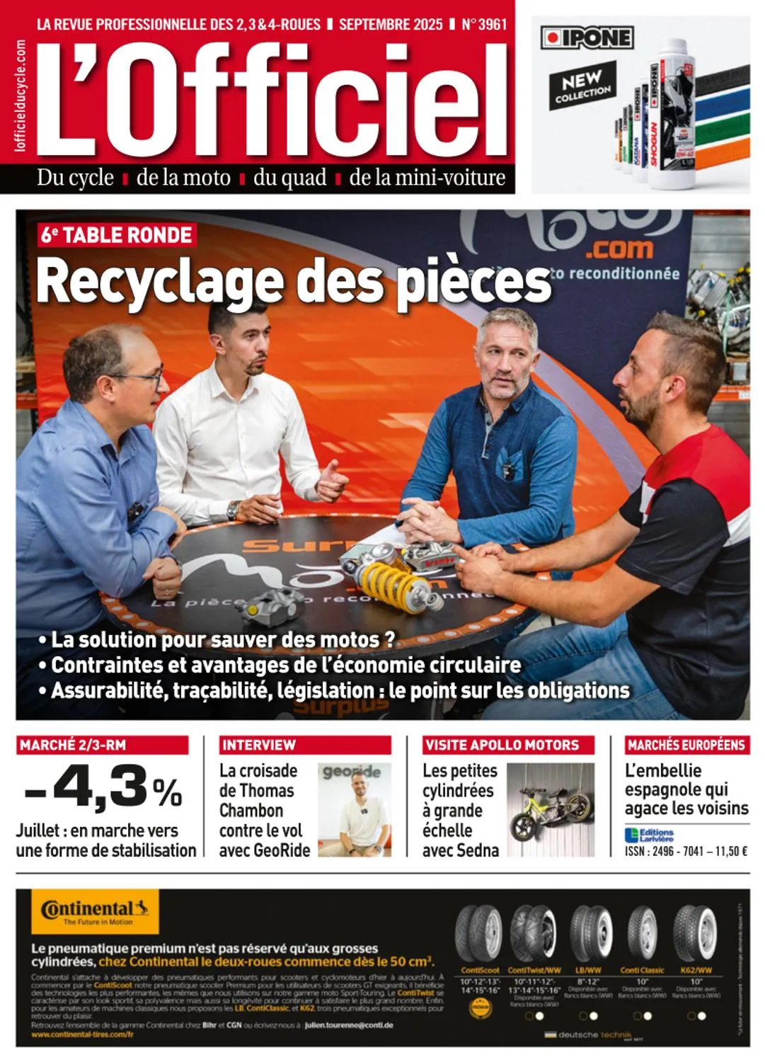 Abonnez-vous à L’Officiel du Cycle, la référence des professionnels de la moto, du cycle, du quad et de la mini voiture depuis plus d'un siècle! Le magazine, qui offre un panorama très complet du secteur, est un outil essentiel pour suivre les marchés et bien gérer son entreprise. Vous y retrouvez les dernières actualités et statistiques, des dossiers thématiques, des informations juridiques et sociales, des conseils de gestion et l'incontournable Data Center. Sa cote de l'occasion est riche de plus de 55 000 références sur 18 années. Elle fait autorité auprès des professionnels de la moto et des experts du secteur de l'assurance. Elle est également utilisée par l'administration des Douanes, l'Armée française et par les notaires dans l'évolution des successions.