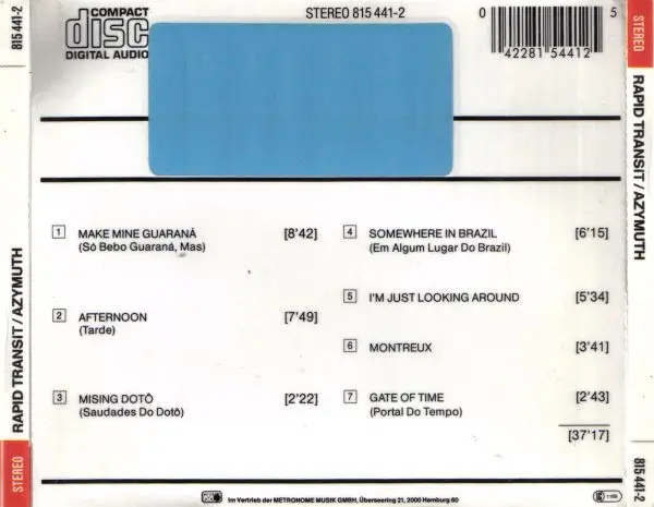 In the 1980s, fusion had two things working against it. On one hand, you had Wynton Marsalis and his disciples arguing that fusion was pseudo-jazz and urging young instrumentalists to stay away from it. On the other hand, you had a lot of NAC radio formats encouraging instrumentalists to play elevator Muzak. But Azymuth weathered those storms. The Brazilian jazzmen didn't feel the need to become retro-boppers in order to prove their legitimacy, and they didn't turn into George Howard or Kenny G clones either – more often than not, the 1980s were a productive decade for the group. Recorded in 1983, Rapid Transit finds them doing what they do best: a rhythmic yet very melodic fusion of jazz, samba, funk, and rock. Josй Roberto Bertrami, Alex Malheiros, and Ivan Conti were never jazz purists, but they definitely bring an improviser's mentality to lyrical offerings like "Somewhere in Brazil," "Afternoon," and "Make Mine Guaranб." Much of this album (which Bertrami produced) was soft enough to appeal to quiet storm formats of the 1980s, but none of the material is mindless or devoid of substance. While parts of Rapid Transit have a lot of quiet storm appeal, the album always has integrity and is never without a brain. Anyone who has spent a lot of time listening to Flora Purim, Airto Moreira, early Return to Forever, or Wayne Shorter's Native Dancer album would do well to give this a very close listen.Track List