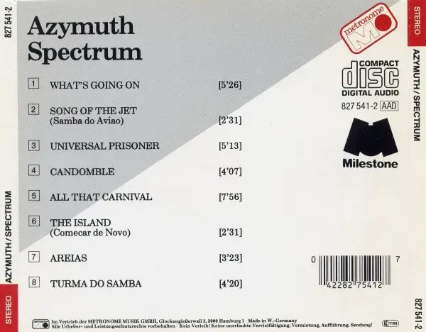 1984's essential Flame was an incredibly tough act to follow, but the excellent album that came after it, Spectrum, is nothing to be ashamed of either. This 1985 LP found Azymuth paying more attention than usual to other artists' songs. While most of the eight selections are Azymuth originals, Spectrum finds the combo interpreting two Brazilian standards (Antonio Carlos Jobim's "Song of the Jet" and Ivan Lins' "The Island") as well as Marvin Gaye's "What's Going On." And interpret is definitely the operative word. These aren't the sort of knee-jerk, note-for-note covers that NAC stations were only too happy to play in the 1980s and 1990s; Azymuth really digs into the songs and puts its own distinctive spin on them. The melody of "What's Going On" is very familiar – anyone with even the most basic knowledge of 1970s soul knows this classic – but what Azymuth does with it is most unusual. In their hands, "What's Going On" loses its sociopolitical lyrics and is transformed into a Brazilian jazz fusion instrumental. A gem that people generally associate with Motown Records and early 1970s soul becomes relevant to the Brazilian samba rhythm. These performances of Gaye, Jobim, and Lins favorites explode the purist myth that Azymuth played pseudo-jazz – the Brazilians do, in fact, bring a jazz mentality to those songs, as well as melodic yet rhythmic originals like "Areias" and "All That Carnival." Unlike jazz purists and rigid bop snobs, Azymuth realizes that being influenced by funk, soul, rock, and samba doesn't necessarily mean that you throw jazz considerations out the window and forget about spontaneity. Spectrum isn't quite as essential as Flame, but it's still an album that Josй Roberto Bertrami and his allies can be proud of.Track List