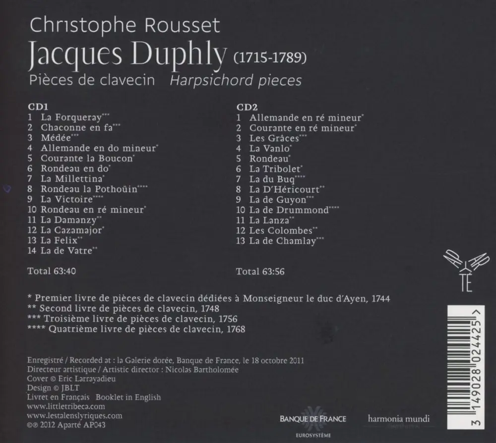 Jacques Duphly is remembered not so much as a composer, but as one of the best harpsichord teachers and performers in Paris during the instrument’s “Golden Age”. His extant oeuvre consists of only four books of harpsichord music (52 compositions in all), technically adept and often challenging works that specialists have tended to regard more as teaching aids than as original, innovative contributions to the literature. In the notes, harpsichordist Christophe Rousset essentially agrees with this assessment, yet given how thoughtful, and in numerous instances how provocative his performances are of these often remarkably beautiful, lively, and charming works, he clearly makes a case that they’re certainly unworthy of neglect.