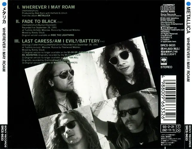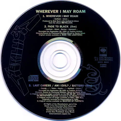 "Wherever I May Roam" is the 1993 single by Americans Metallica. Taken from their album Metallica (b/k/a The Black Album). this is taken from a Japanese CD5 released by Sony.