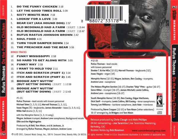 Rufus Thomas' first album following Stax's break from the Atlantic had "Do the Funky Chicken" as its centerpiece, so the emphasis upon good-humored dance tunes was unsurprising. There were some weird moments, particularly the down-and-bestial seven-minute update of "Sixty Minute Man" (on which Rufus sounds like he's singing in tongues), a remake of "Bear Cat," and a two-part version of "Old McDonald Had a Farm." Still, the slightly goofy uptempo arrangements can get a little tiresome, and since his best hits from the period are better than the album-only tracks, almost everyone should just stick with a compilation. Some editions add seven bonus tracks from 1968-1974 singles, which are OK but not essential; Eddie Floyd's "Funky Mississippi" (from 1968) is about the best.Track List