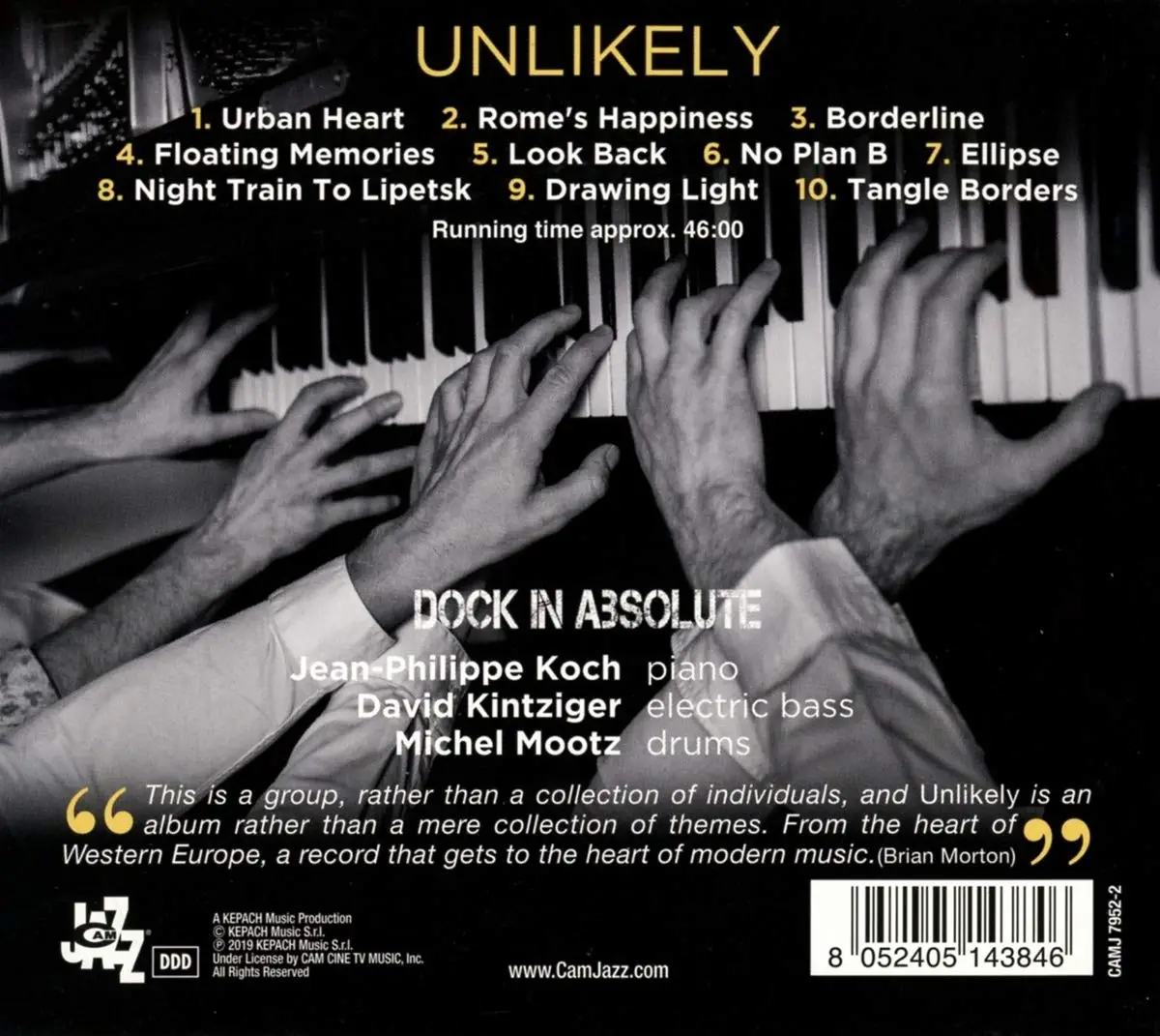 The second album by Luxembourg trio Dock In Absolute offers further confirmation of their genre-shifting approach to trio jazz, with familiar bop elements intermingled with classical, pop and post-rock elements. Pianist Jean-Philippe Koch’s romantic melodism, electric bassist David Kintziger’s flowing lyricism (which is reminiscent of Steve Swallow) and percussionist Michel Mootz’s approach to the whole kit as an integrated musical instrument yields up an album of sustained and often surprising beauty. Now regulars in the CAM JAZZ catalogue as well as on the European festival circuit, Dock In Absolute bring an immediately recognisable spin to an otherwise well-worn instrumental combination. This is a group, rather than a collection of individuals, and Unlikely is an album rather than a mere collection of themes. From the heart of Western Europe, a record that gets to the heart of modern music. (Brian Morton)