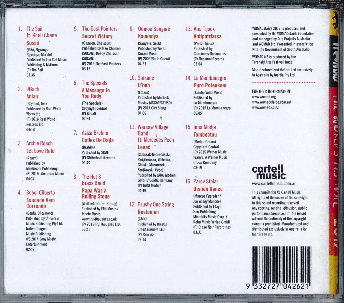WOMAD is the World of Music, Arts & Dance (founded by the musician Peter Gabriel in 1982), and WOMADelaide, the Australian WOMAD festival, kicked off in 1992. Over the past 20 years WOMADelaide has become one of the nation's favourite outdoor festivals. WOMAD takes place March 10th-13th at the Botanic Park, Adelaide. Featuring key acts performing at WOMAD such as Archie Roach, Sinkane, The Hot 8 Brass Band and The East Pointers.Tracklist: