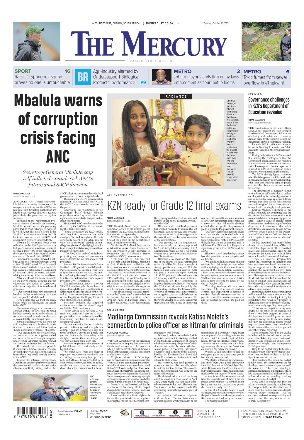 Morning daily covering KwaZulu-Natal with national and local reporting, in-depth business coverage and analysis through dedicated opinion and enterprise pages.
