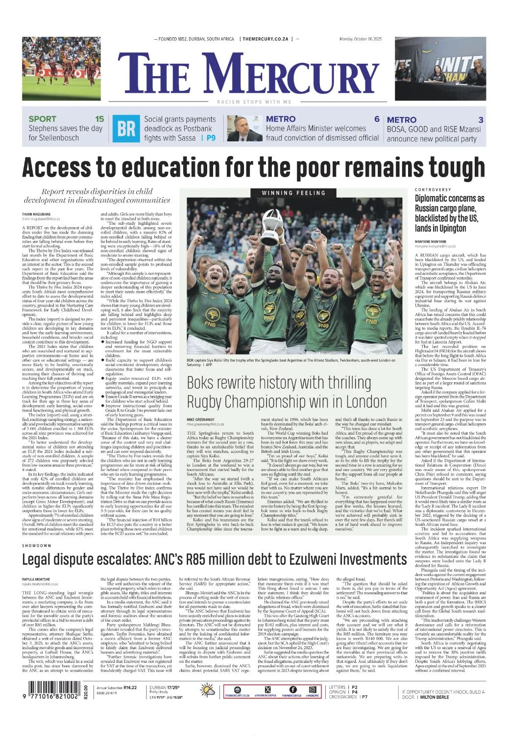 Morning daily covering KwaZulu-Natal with national and local reporting, in-depth business coverage and analysis through dedicated opinion and enterprise pages.