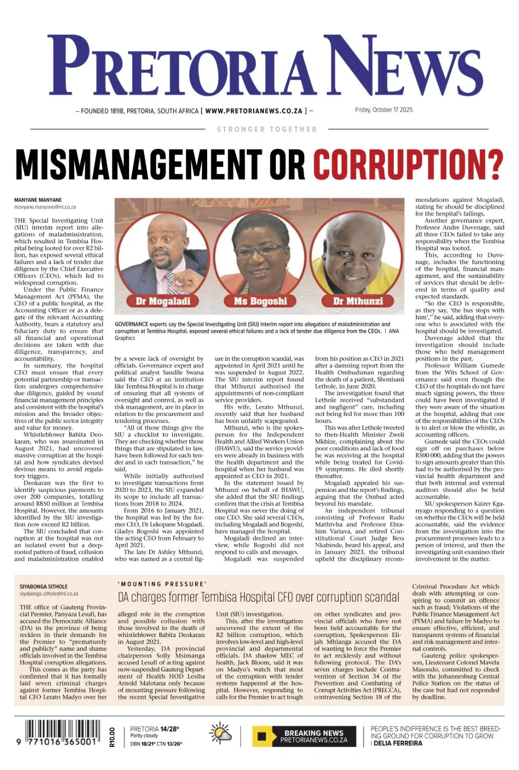 Pretoria News is a newspaper appearing in the city of Pretoria, in the Tshwane Metropolitan area, every day from Monday to Friday. The Pretoria News offers comprehensive coverage of local news, as well as national and international news, comment and analysis by experts, sport, entertainment and lifestyle. The daily Tonight supplement highlights what’s happening on the entertainment front. Other popular regular features include Consumer Watch, Metro Watch, Food for Thought, What’s On and a weekly Motoring supplement. Business Report, South Africa’s national financial daily, is an important addition for decision-makers. The Classifieds include the popular Workplace on Wednesdays, and the weekly Thursday Motoring supplement is not to be missed.