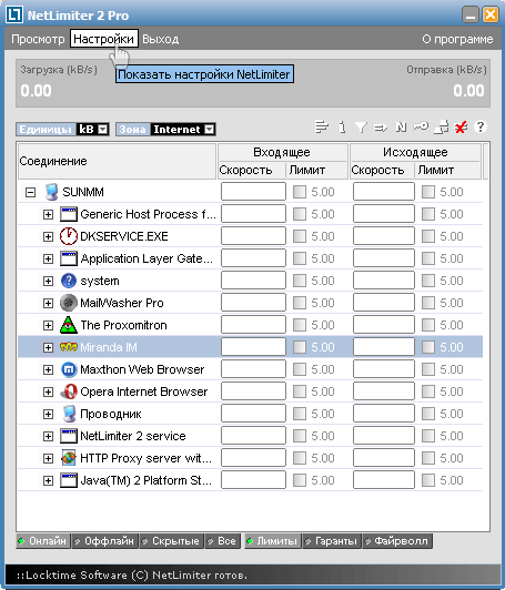 У Вас широкий интернет-канал, но иногда какое-нибудь приложение забирает его весь под себя? NetLimiter 2 позволяет Вам контролировать использование ширины интернет-канала приложениями, так что Вы легко можете ограничить полосу пропускания для, скажем, eMule. Кроме того, NetLimiter позволяет выделить приложению гарантированную ширину канала. Имеет встроенный файрволл (можно отключить). Есть функция удаленного управления другими машинами с установленным NetLimiter.