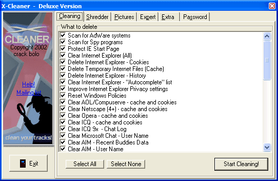 X-Cleaner Deluxe destroys cookies, eliminates files, cleanses .dat, finds and removes embarrassing pictures, reveals cloaked windows, and more. What type of computer will it work on? Almost any windows machine. X-Cleaner cleans most versions of Internet Explorer, Netscape, Opera and AOL browsers.