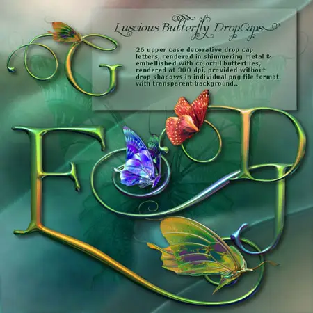 26 beautifully reflective, bevelled metalic dropcap letters, embellished with colorful butterflies. Based on the decorative font, "Albemarle Swash", rendered at 300 dpi and provided without drop shadow in individual png file formats on a transparent background for convenient use.? No lower case letters are included, this product is only Drop Caps.? Background not included.