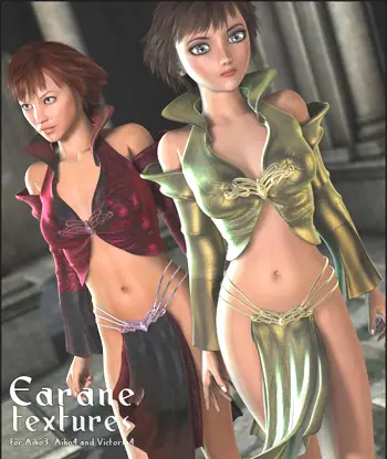 Five beautiful textures for the Earane Outfit. Find out how versatile the outfit can be with these texture selections taking your characters from heroine to evil enchantress.Complete with both DAZ Studio and Poser material presets.