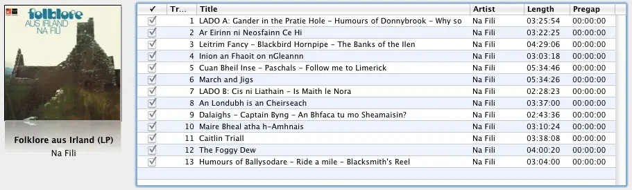 Ninguna duda que este LP "Folklore aus Irland" es una compilación del conjunto Na Filí hecha en Alemania, bajo el patrocinio del gran sello Harmonia Mundi. Mi amigo houtch60 (dueño de este LP), sugiere que esta grabación pudo ser hecha en una iglesia, y puede ser perfectamente. Aunque yo me inclinaría a pensar que es un efecto de eco hecho en estudio y aplicado sobre los masters originales. Una duda que los expertos nos aclararán (algún día). El disco suena perfecto y por supuesto, es una preciosidad.