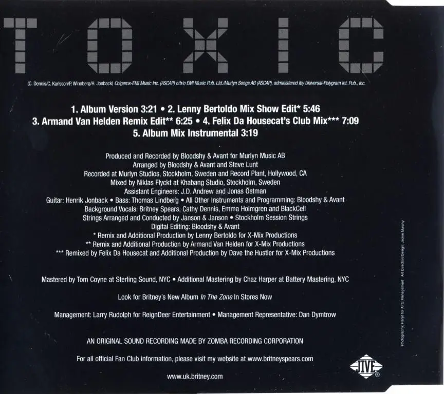 "Toxic" is a song recorded by American singer Britney Spears for her fourth studio album "In the Zone" (2003). It was written and produced by Christian Karlsson and Pontus Winnberg (known collectively as Bloodshy & Avant), with additional writing from Cathy Dennis and Henrik Jonback. The song released on January 13, 2004, by Jive Records, as the second single from "In the Zone". The song was originally offered to Kylie Minogue for her ninth studio album "Body Language" (2003), but she rejected it. After trying to choose between "(I Got That) Boom Boom" and "Outrageous" to be the second single from In the Zone, Spears selected "Toxic" instead. A dance song with elements of bhangra music, "Toxic" features varied instrumentation, such as drums, synthesizers and surf guitar. It is accompanied by high-pitched Bollywood strings, sampled from Lata Mangeshkar and S. P. Balasubrahmanyam's "Tere Mere Beech Mein" (1981), and breathy vocals. Its lyrics draw an extended metaphor of a lover as a dangerous yet addictive drug. The song has received acclaim from music critics, deeming it the strongest track of In the Zone, and praised its hook and chorus. "Toxic" won Spears her first and only Grammy Award at the 2005 ceremony in the category of Best Dance Recording. "Toxic" attained worldwide success, reaching the top-five in 15 countries, while topping the charts in Australia, Canada, Hungary, Ireland, Norway and the United Kingdom. In the United States, it became her fourth top-ten single, peaking at #9. The accompanying music video for the song was directed by Joseph Kahn and features references to Blade Runner, The Seven Year Itch and the films of John Woo. It portrays Spears as a secret agent in the search of a vial of green liquid. After she steals it, she enters an apartment and poisons her unfaithful boyfriend. The video also includes interspersed scenes of Spears naked with diamonds on her body. After Janet Jackson's Super Bowl incident, the video was considered too racy for MTV and was moved to late-night programming. Spears has performed "Toxic" in a number of live appearances, including the 2004 NRJ Music Awards and in three of her concert tours. It was the opening number of The Onyx Hotel Tour (2004), where she sang atop of a bus wearing a black catsuit; Spears also performed remixed versions of the song at The Circus Starring Britney Spears (2009), the Femme Fatale Tour (2011) and Britney: Piece of Me (2013). "Toxic" has been covered by artists such as Mark Ronson, A Static Lullaby, Reece Mastin and Ingrid Michaelson, and in television series Glee. The song has also appeared in feature films such as Knocked Up, You Again and television series Doctor Who. The song has been included in lists by Pitchfork, NME and Rolling Stone as one of the best songs of the decade. In June 2017, a demo for "Toxic", containing Spears' unedited vocals was leaked to YouTube.