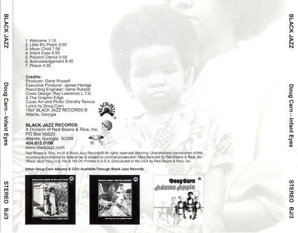 My absolute favorite Black Jazz album was Infant Eyes, by pianist Doug Carn and his wife, Jean Carn. The record had a sensual, powerful feel. What made the album a hit were the soulful lyrics the Carns crafted for jazz standards such as Bobby Hutcherson's Little B's Poem, Wayne Shorter's Infant Eyes, John Coltrane's Acknowledgment from A Love Supreme, and Horace Silver's Peace. Doug's arrangements and Jean's searing, passionate vocals gave the album a distinctly 1970s African-American feel.Track List