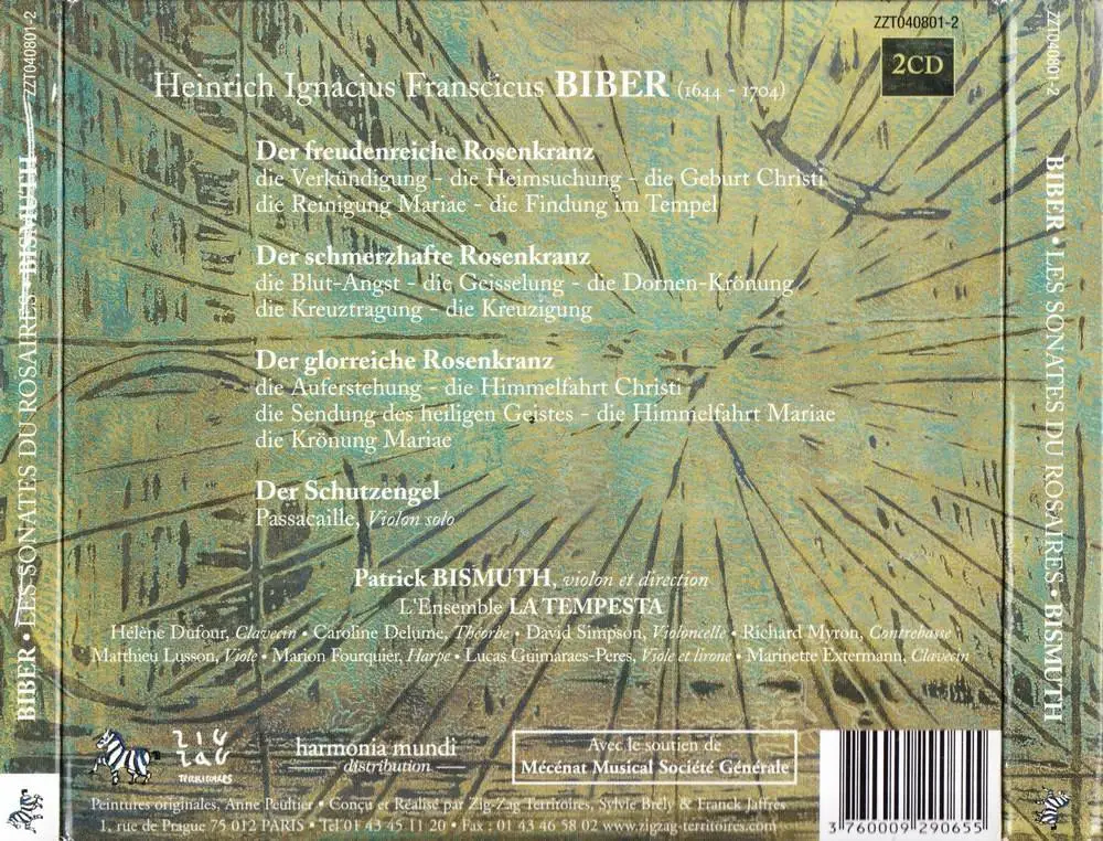 Just a generation ago, Heinrich von Biber's Rosary (or "Mystery") Sonatas were looked upon as ultra-rare repertoire, the sort of thing a Classical record collector would have to go out of his/her way to obtain on recordings. It appears that by now anyone who plays Baroque violin music to any degree of seriousness has had contact with Biber's sonatas, and there are no less than 20 complete or near complete recordings of Rosary Sonatas available. Make that 21 with Zig Zag Territories' Biber: Les Sonates du Rosaires, featuring violinist Patrick Bismuth with continuo provided by the ensemble La Tempesta.