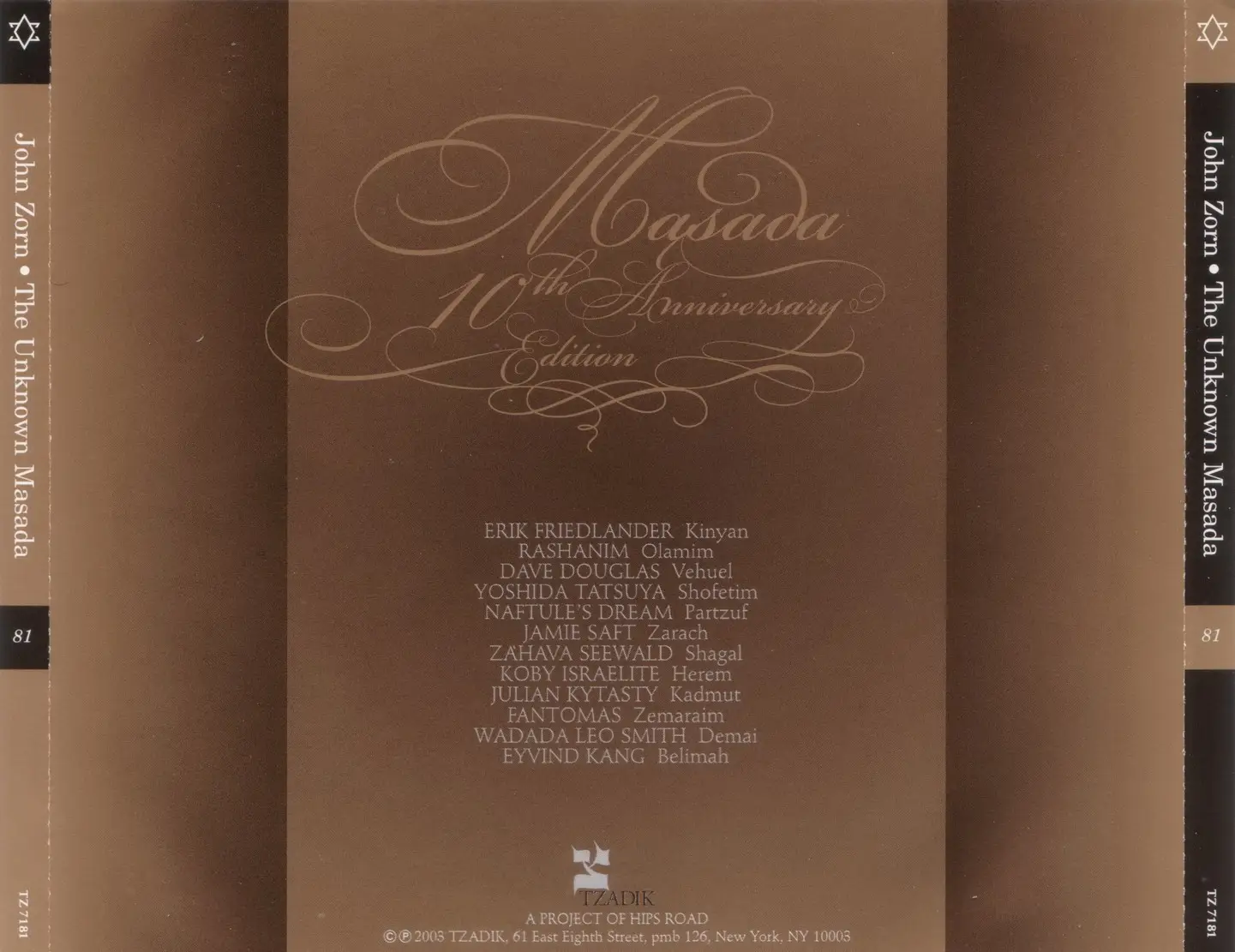 The third installment in this Tenth Year celebration is the most exciting yet. Fourteen tunes from Zorn’s legendary Masada songbook that have never been heard before. Performed and arranged by an incredible lineup of musicians, the music here touches upon hard rock, world beat, klezmer and jazz, often all in the same arrangement! Highlights include a lyrical ballad by Wadada Leo Smith, two explosive rock tracks by the powerful Japanese duo the Ruins and Mike Patton’s Fantomas, and a gorgeous solo performance by Ukrainian bandura virtuoso Julian Kytasty.