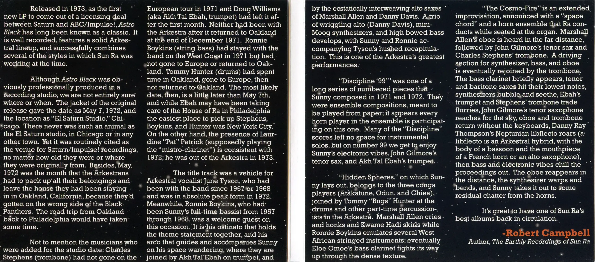 One of the darkest Sun Ra albums of the early 70s – and a set that's also a bit unusual in his catalog as well! The album was issued during Ra's run with Impulse Records – a period that mostly saw the label reissue previous records from the Saturn catalog – save for a rare few like this one, which was an unusual all-new batch of material for Impulse! Because of that, it's been a bit overlooked in later years – maybe missed as less authentic, but actually some of the most striking sounds that Ra created at the time! There's a very strong tension here between electric and acoustic elements – not in the usual fusion-based way, but instead with this vibe that often has the electric instruments providing darker areas of sound, while the woodwinds and percussion have a way of humanizing the proceedings. June Tyson's also at her moodiest on the title track, "Astro Black" – and other titles include "Hidden Spheres", "Discipline 99", and the long improvisation "Cosmo Fire".
