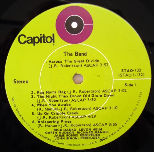 "The Band, the group's second album, was a more deliberate and even more accomplished effort, partially because the players had become a more cohesive unit and partially because guitarist Robbie Robertson had taken over the songwriting, writing or co-writing of all 12 songs… The arrangements were simultaneously loose and assured, giving the songs a timeless appeal, while the lyrics continued to paint portraits of 19th century rural life (especially Southern life, as references to Tennessee and Virginia made clear), its sometimes less savory aspects treated with warmth and humor." - AMGMichael Fremer remarked that the best sounding pressings of The Band's second album are the green label Capitol LPs with RL in the deadwax.