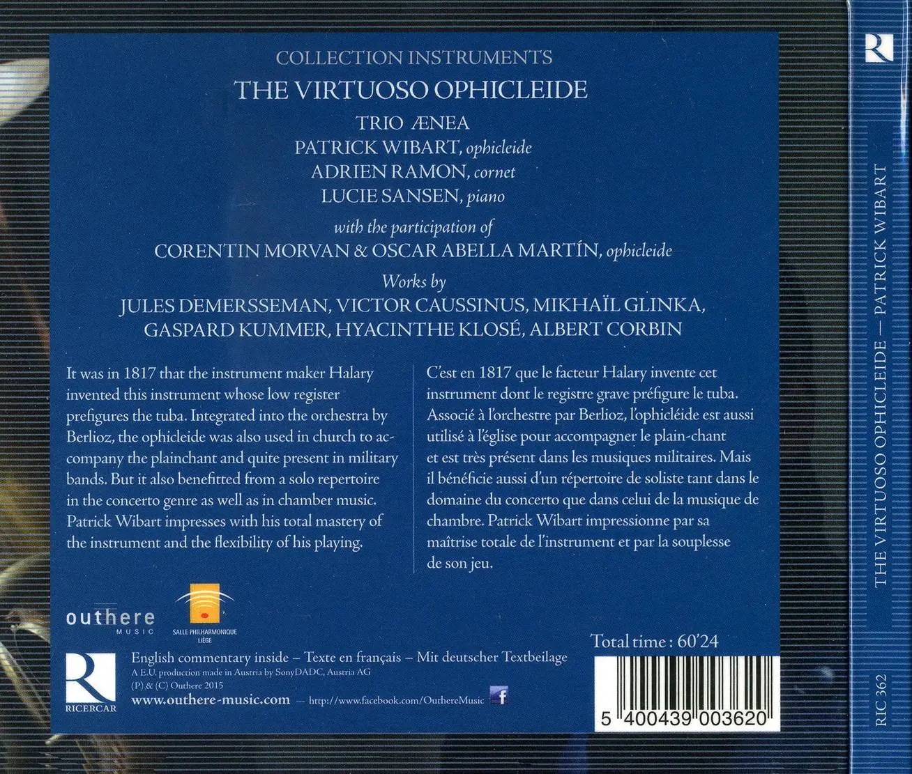 It was in 1817 that the instrument maker Halary invented this instrument whose low register prefigures the tuba. Integrated into the orchestra by Berlioz, the ophicleide was also used in church to accompany the plainchant and quite present in military bands. But it also benefitted from a solo repertoire in the concerto genre as well as in chamber music. Patrick Wibart impresses with his total mastery of the instrument and the flexibility of his playing. To be discovered imperatively.