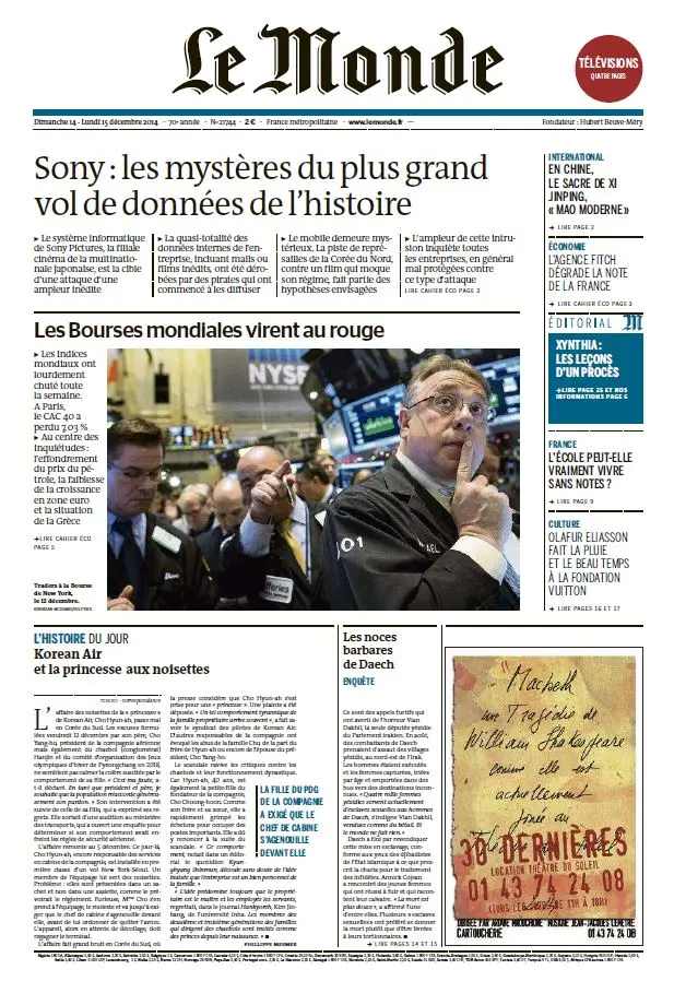 LE MONDE du dimanche 14 et lundi 15 decembre 2014