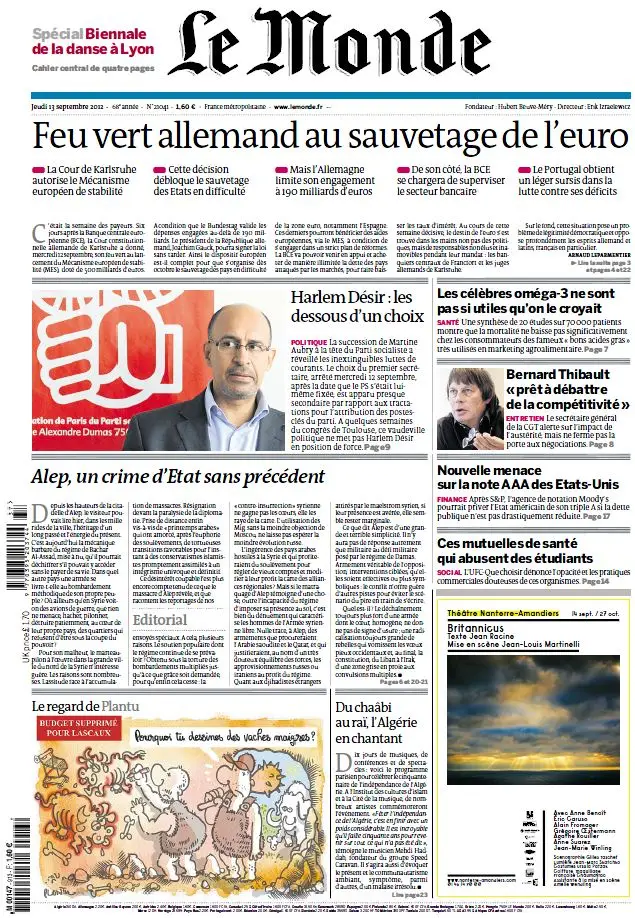 Le Monde et Supplément Danse du Jeudi 13 Septembre 2012