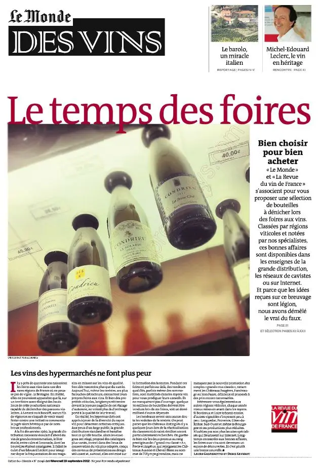 Le Monde et Supplément Vins du Mercredi 19 Septembre 2012