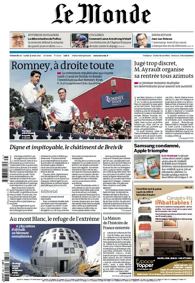 Le Monde et Suppléments du Dimanche 26 et Lundi 27 Aout 2012