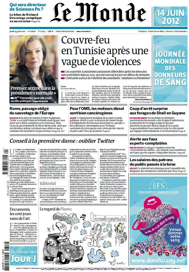 Le Monde et Supplément Don du Sang du Jeudi 14 Juin 2012