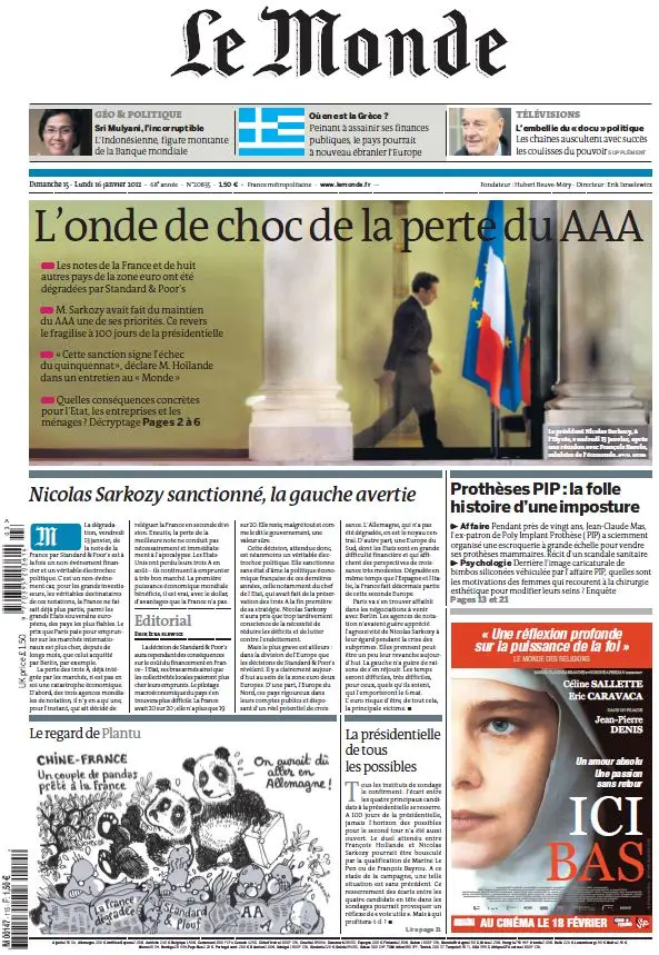 Le Monde du 15 Janvier 2012 + Supplément TV + Supplément Geo