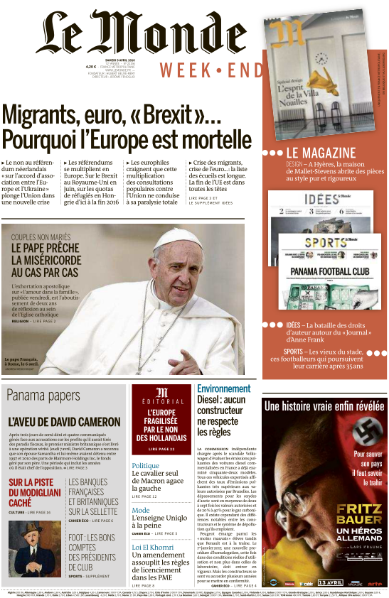 Le Monde du Samedi 9 Avril 2016