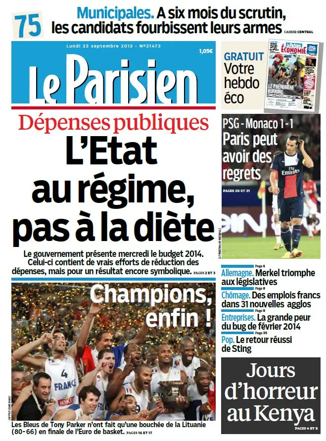 Le Parisien + Journal de Paris du Lundi 23 Septembre 2013