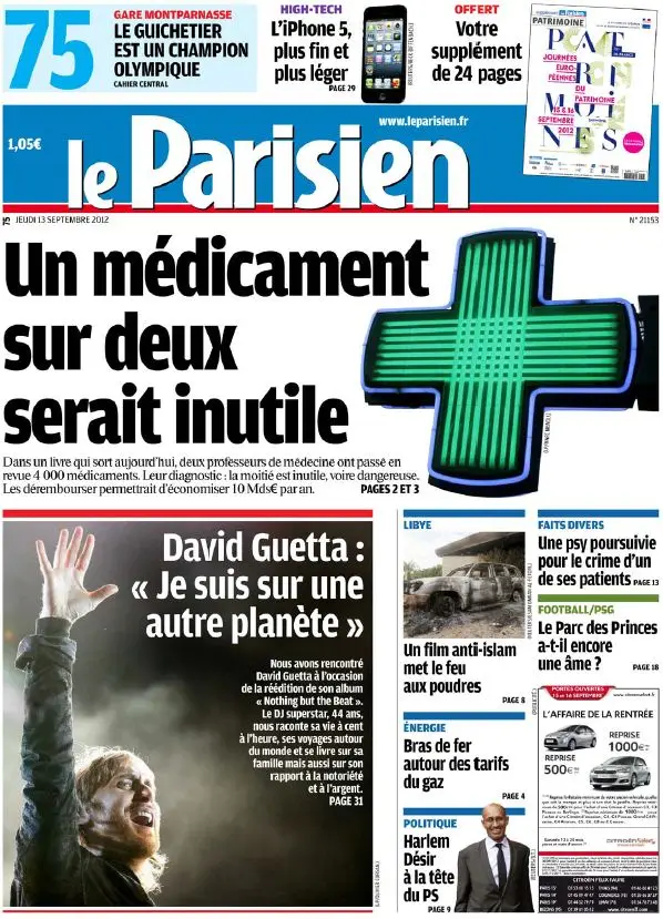 Le Parisien + Cahier Paris du Jeudi 13 Septembre 2012
