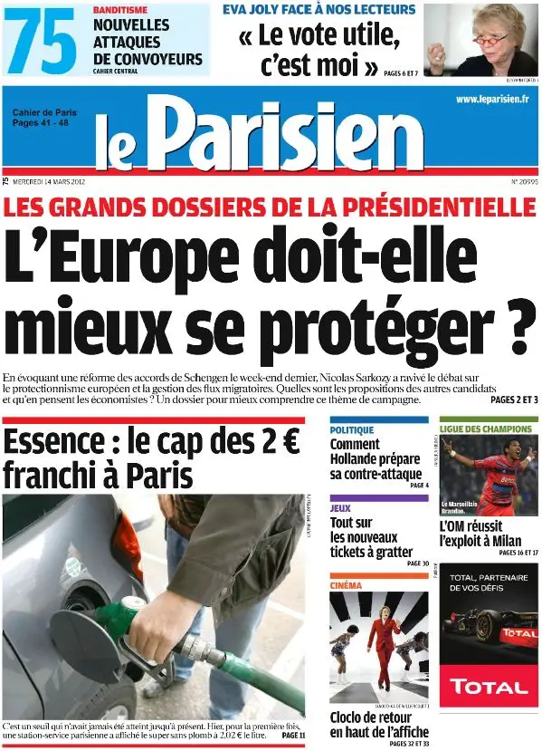 Le Parisien + Cahier Paris du Mercredi 14 Mars 2012