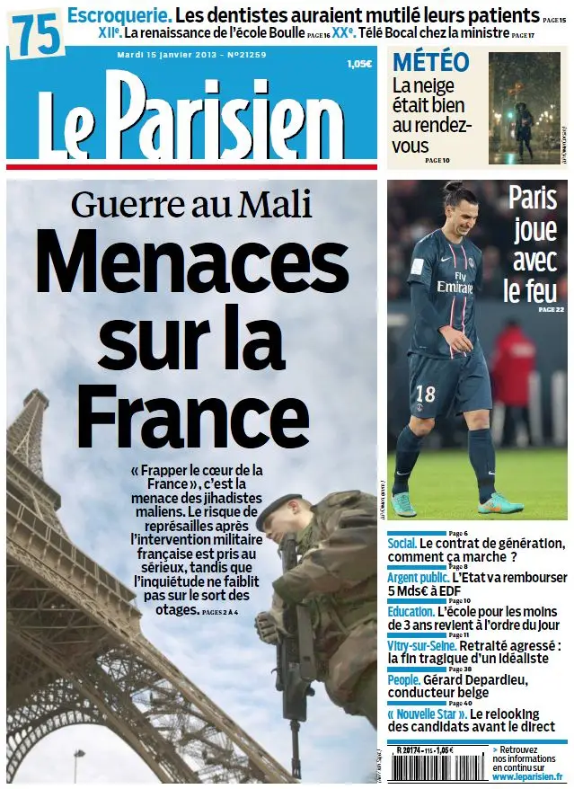 Le Parisien + Cahier Paris du Mardi 15 Janvier 2013