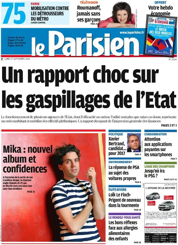 Le Parisien + Cahier Paris du Lundi 17 Septembre 2012