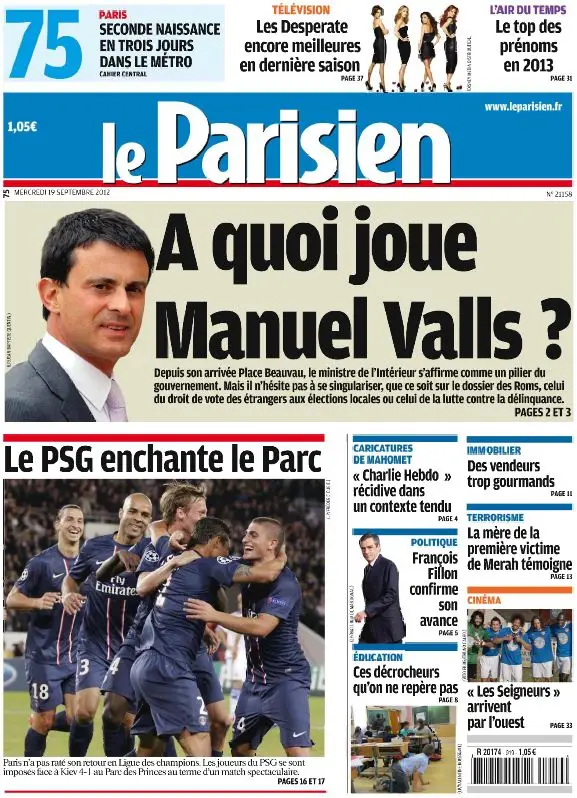 Le Parisien + Cahier Paris du Mercredi 19 Septembre 2012