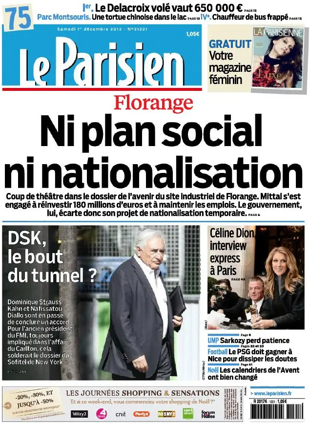 Le Parisien + Cahier Paris du Samedi 1er Décembre 2012