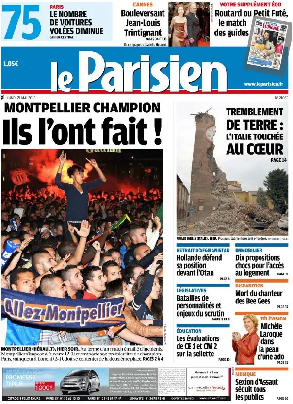 Le Parisien + Cahier Paris du Lundi 21 Mai 2012