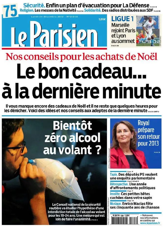Le Parisien + Cahier Paris du Lundi 24 Décembre 2012