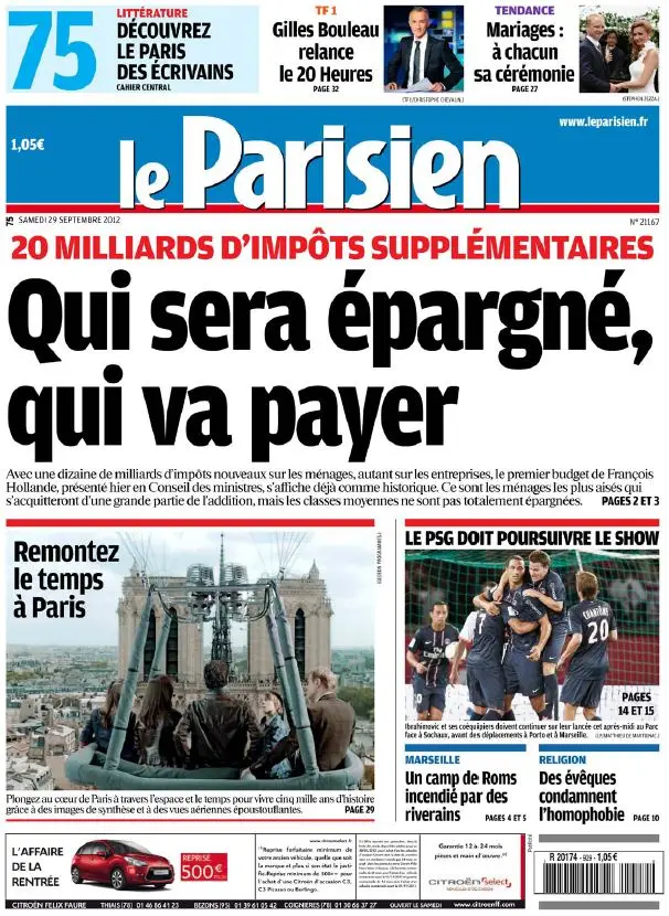 Le Parisien + Cahier Paris du Samedi 29 Septembre 2012