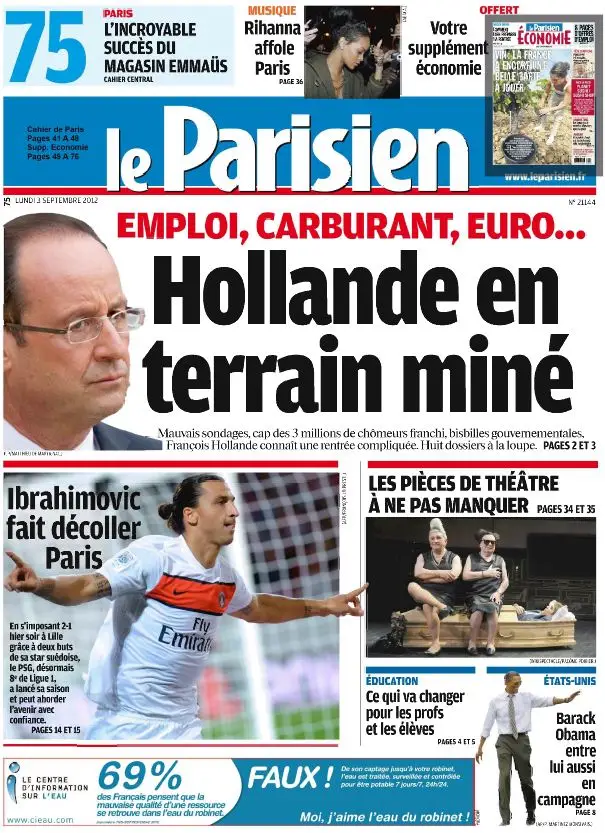 Le Parisien + Cahier Paris du Lundi 3 Septembre 2012