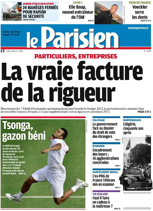 Le Parisien & Cahier Paris du Jeudi 5 Juillet 2012