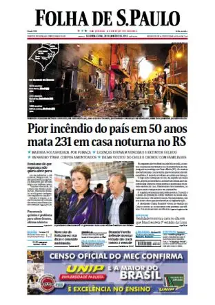 * Pior incêndio do país em 50anos mata 231 em casa noturna no RS.