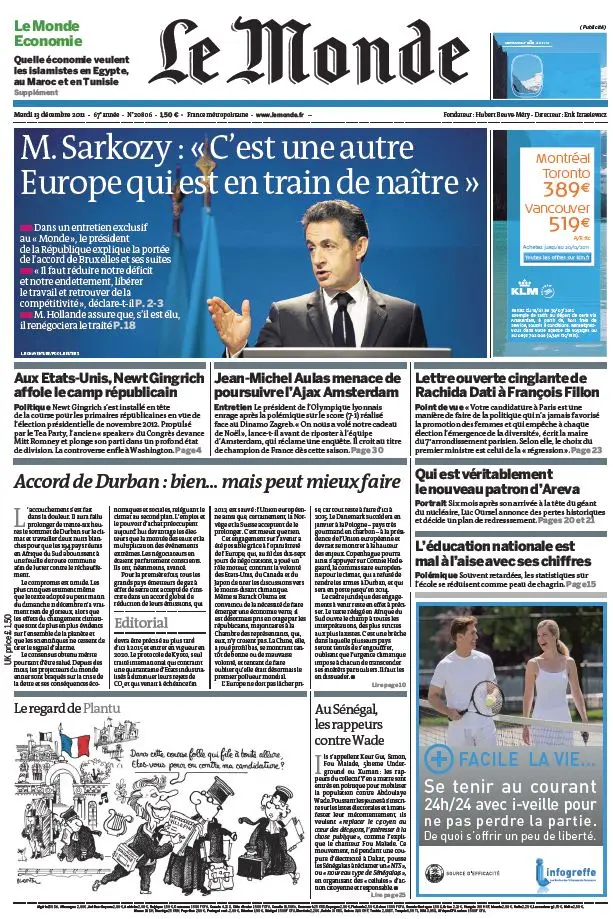 Le Monde et Supplément Économie du Mardi 13 Décembre 2011