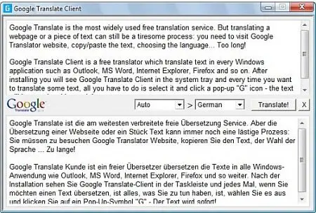 Translator for Windows which enables the fast translation of text in the majority of applications, such as Outlook, MS Word, Internet Explorer, and Firefox using the Google Translate service. Google Translate is one of the most popular computer-aided translation services, however, using an online-translator for text translation is inconvenient: you have to launch the browser, open the website, copy and paste the text, select the language… Too time-consuming! Now you can translate web-pages, electronic mail and other documents without opening online-translation sites and buying expensive bulky programs. This free translator is always at hand – you simply need to select the text with your mouse!