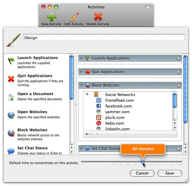 To start, create an activity (design, study, write, etc) and choose actions (shown below) to run every time you concentrate. When ready, just click “concentrate." All your distractions will disappear and a timer will appear to help you stay focused.
