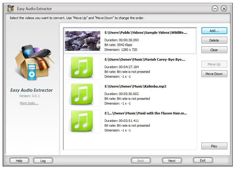 Easy Audio Extractor - Extract audio from video and save the extracted sound in WMA, MP3, WMA, OGG, AAC, M4A, FLAC and MP2 formats..