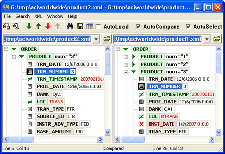 ExamXML is a powerful and easy to use a visual XML differencing tool for Windows. It was specially developed for comparing and merging XML files in an intelligent manner. It provides best-in-class features that distinguish ExamXML from other XML differencing tools. Unique to ExamXML is its ability to ignore elements that match users' defined condition. In addition to the usual textual comparison, ExamXML adds ability to compare numbers in numeric format and dates in date / time formats. ExamXML displays XML documents in a tree view, highlighting differences down to the level of elements, words or attributes, so that you can view exactly which attributes and elements have been added, modified or deleted. Red color means that the element has been removed, green means that the element has been changed.